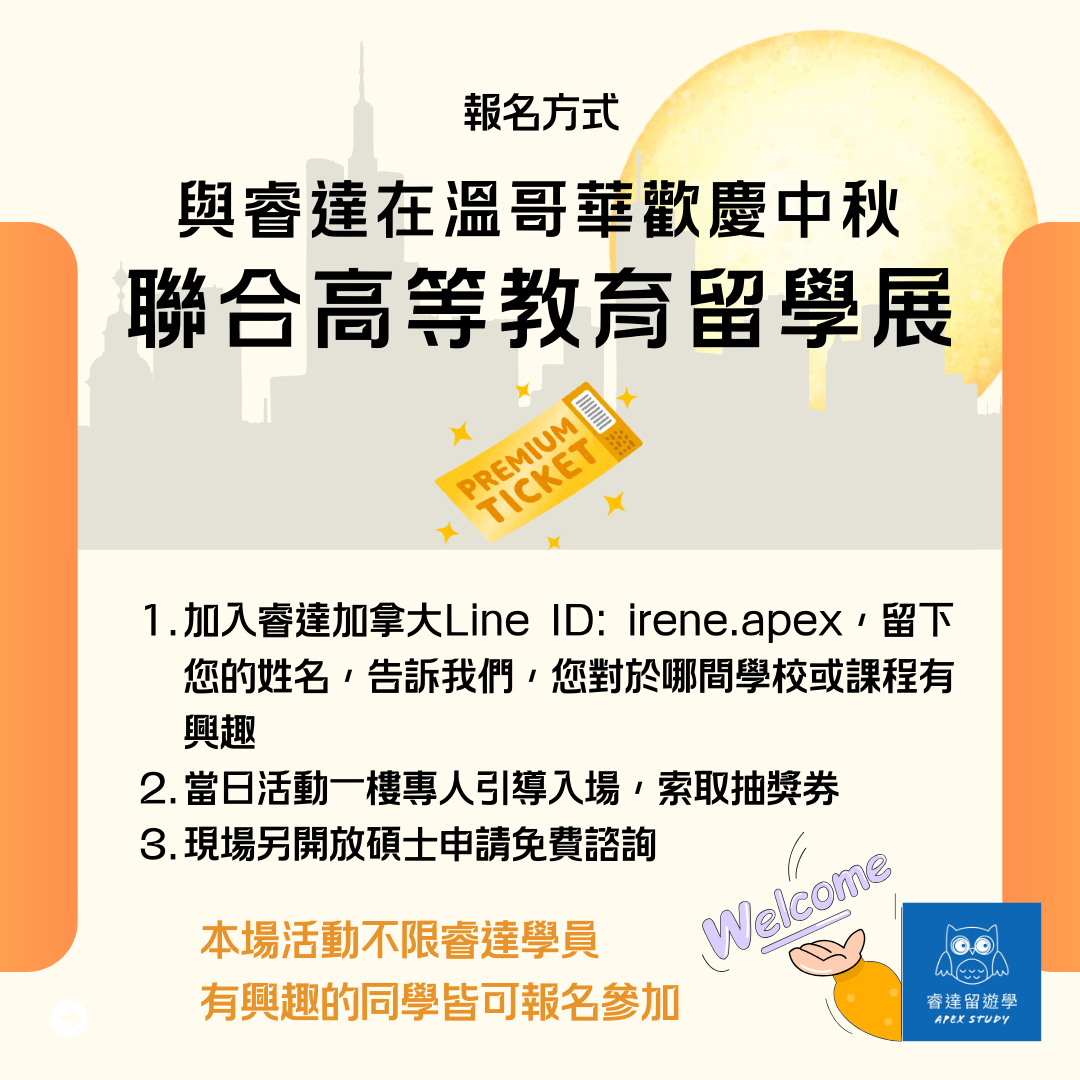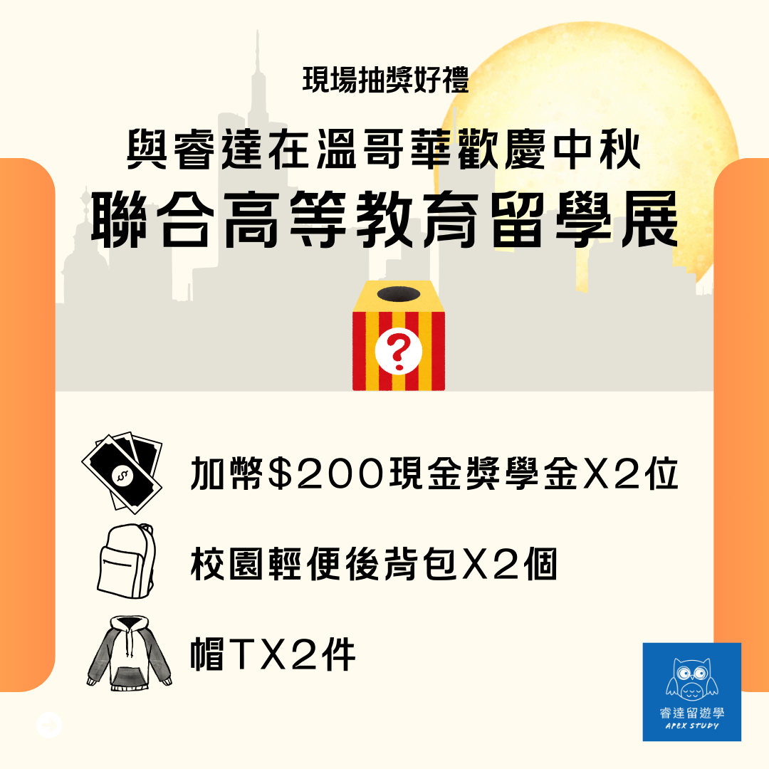 與睿達留遊學一起在加拿大歡度中秋節 X 溫哥華高等教育聯合教育展,9月12日(四)晚上7-9點,就在睿達溫哥華辦公室大樓三樓舉行,市中心圖書館旁。