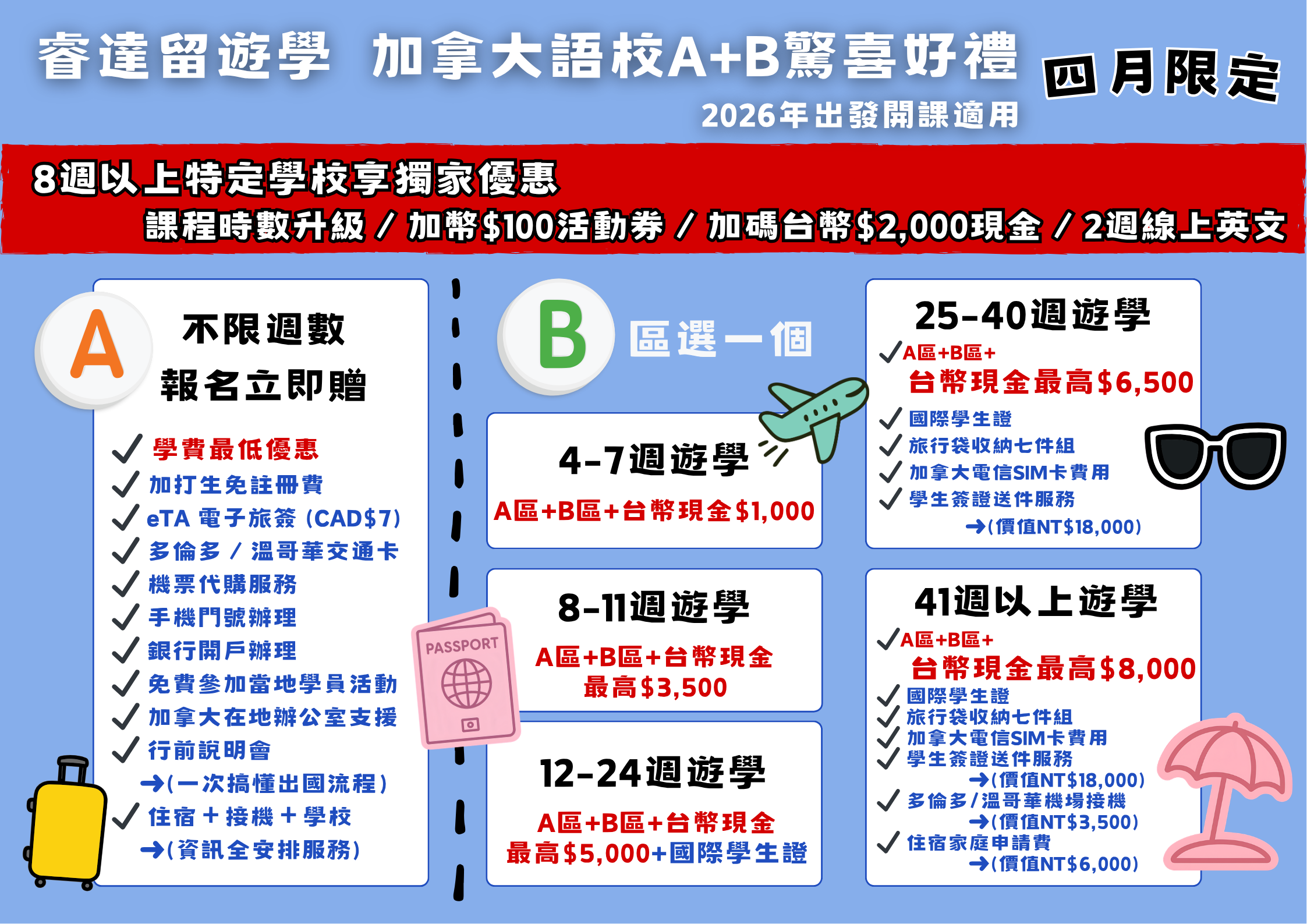 睿達留遊學加拿大語校遊學🅰︎區+🅱︎區驚喜好禮