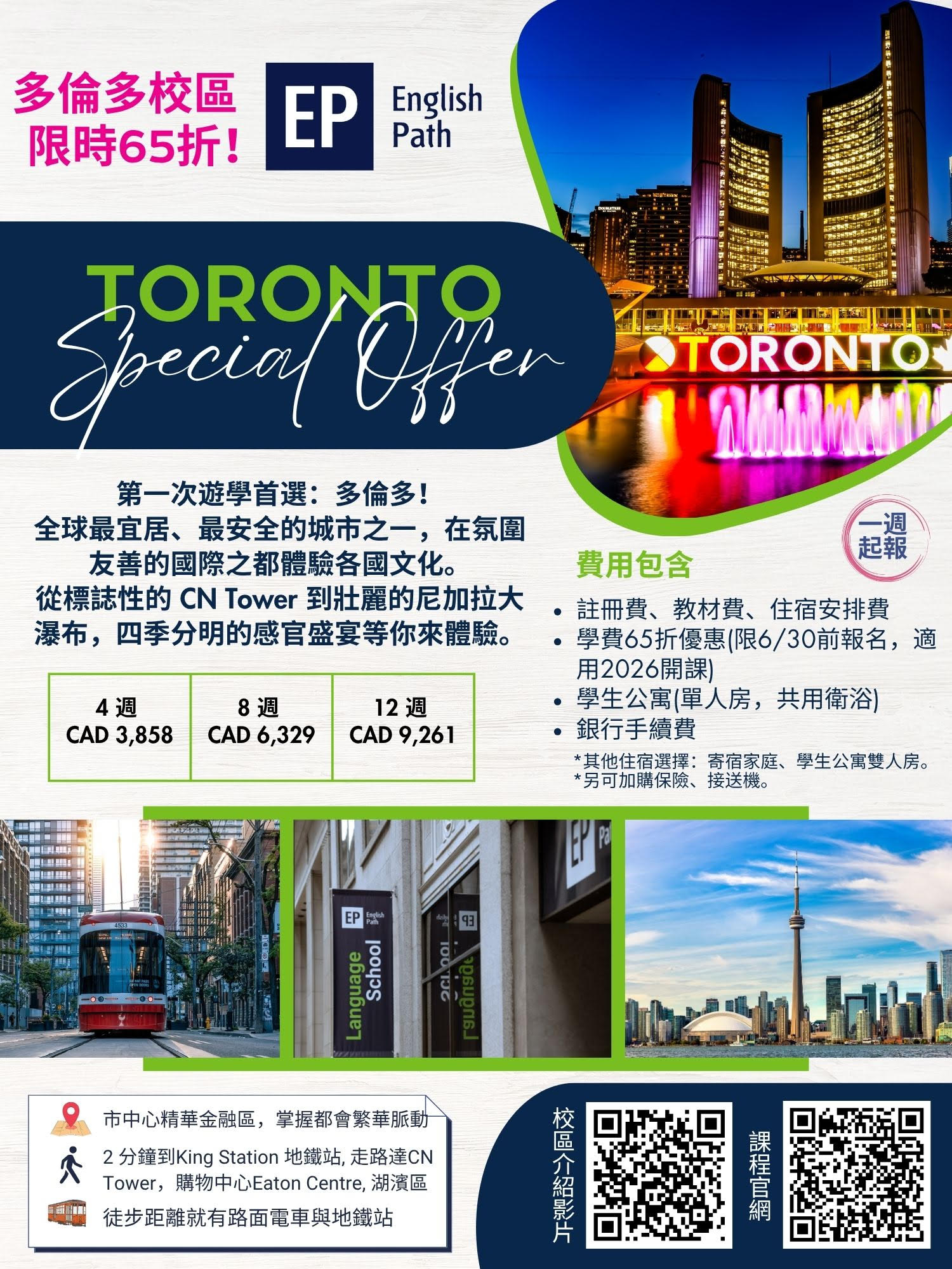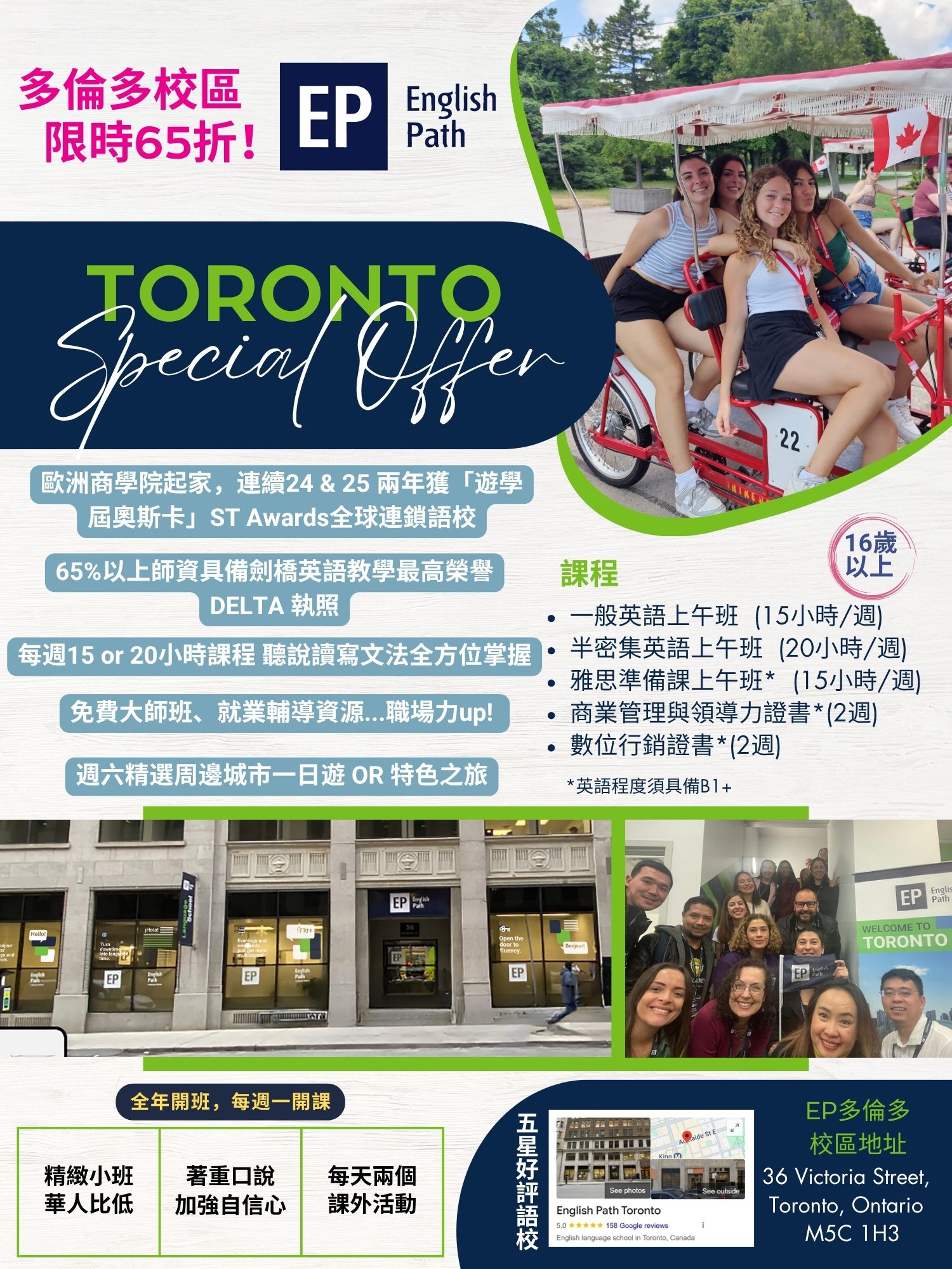 的多倫多校區。作為曾連續兩年榮獲「遊學屆奧斯卡」之稱的 ST Awards 全球連鎖語校獎項得主,EP 以卓越的教學品質與優質的學習環境,成為許多學生規劃加拿大進修的首選。