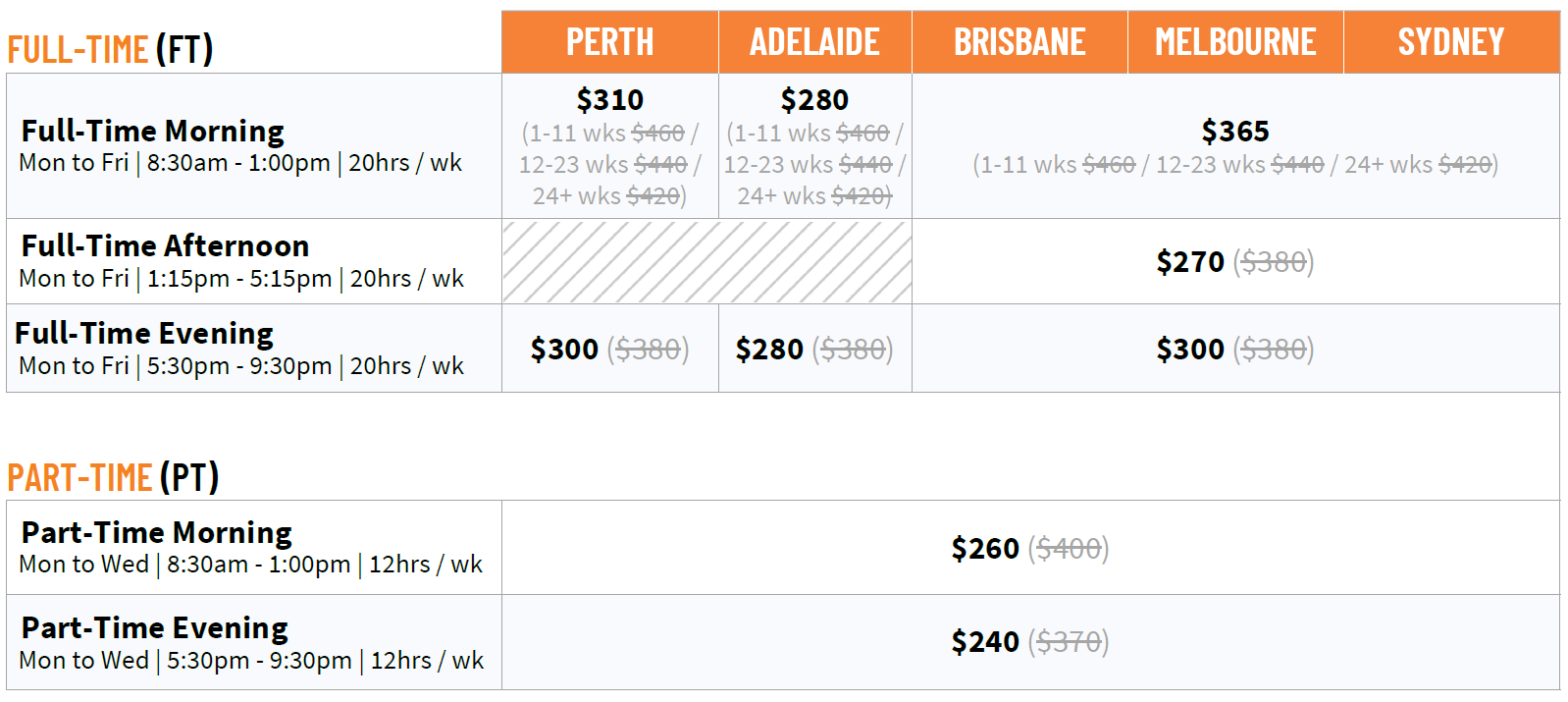 優惠活動 | 1️⃣ 墨爾本,布里斯本,伯斯校區全日上午班11週送1週 2️⃣ 澳洲全校區下午班和晚上班,阿德雷德校區全時段10週送2週 優惠週數均可累計 |