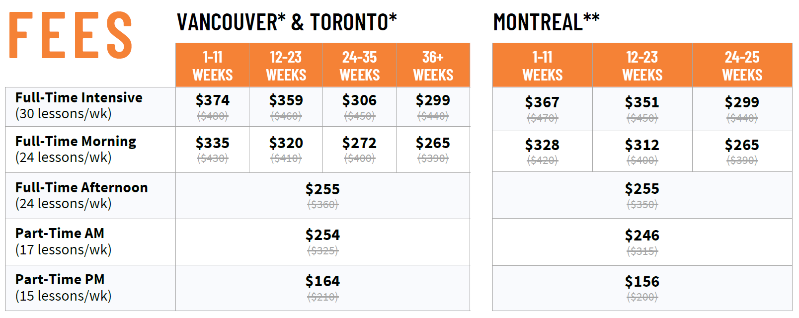 | 其他費用 | ▶▶▶ | 註冊費加幣$200,材料費1-4週加幣$60,5週以上$15/週,最多不超過$450 |