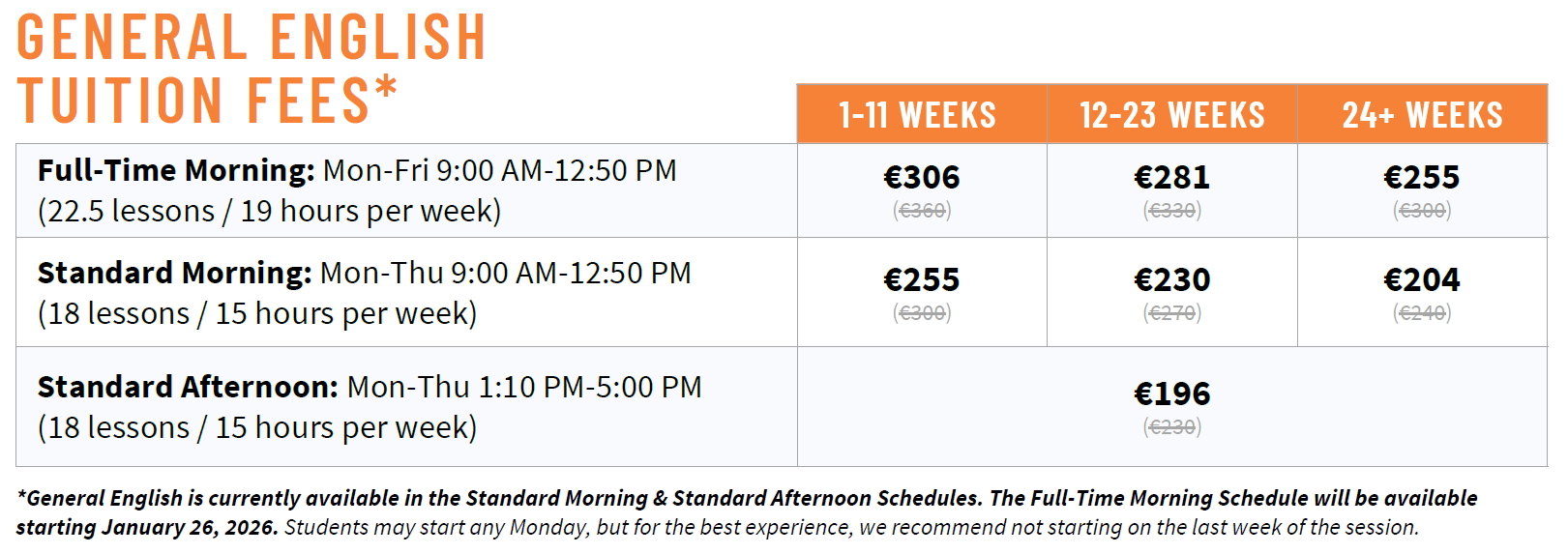 優惠活動 | 1️⃣ 遊學打工課程25+8,上午班學費€4,000 (2026年1月26日起,可享有免費的週五選修課!) 2️⃣ 遊學打工課程25+8,下午班學費€3,000 3️⃣ 長短期一般英語課程,學費享優惠折扣 |