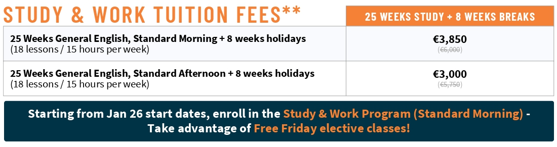 都柏林第2季優惠包含一般英語學費八折優惠、25 + 8 打工遊學上午班 €3,850 / 下午班 €3,000、住宿家庭單人含早晚餐折扣、學生宿舍暑期免加價,以及限時推出的全新短期學習優惠,非常適合希望在愛爾蘭學習英語並體驗旅行的學生!