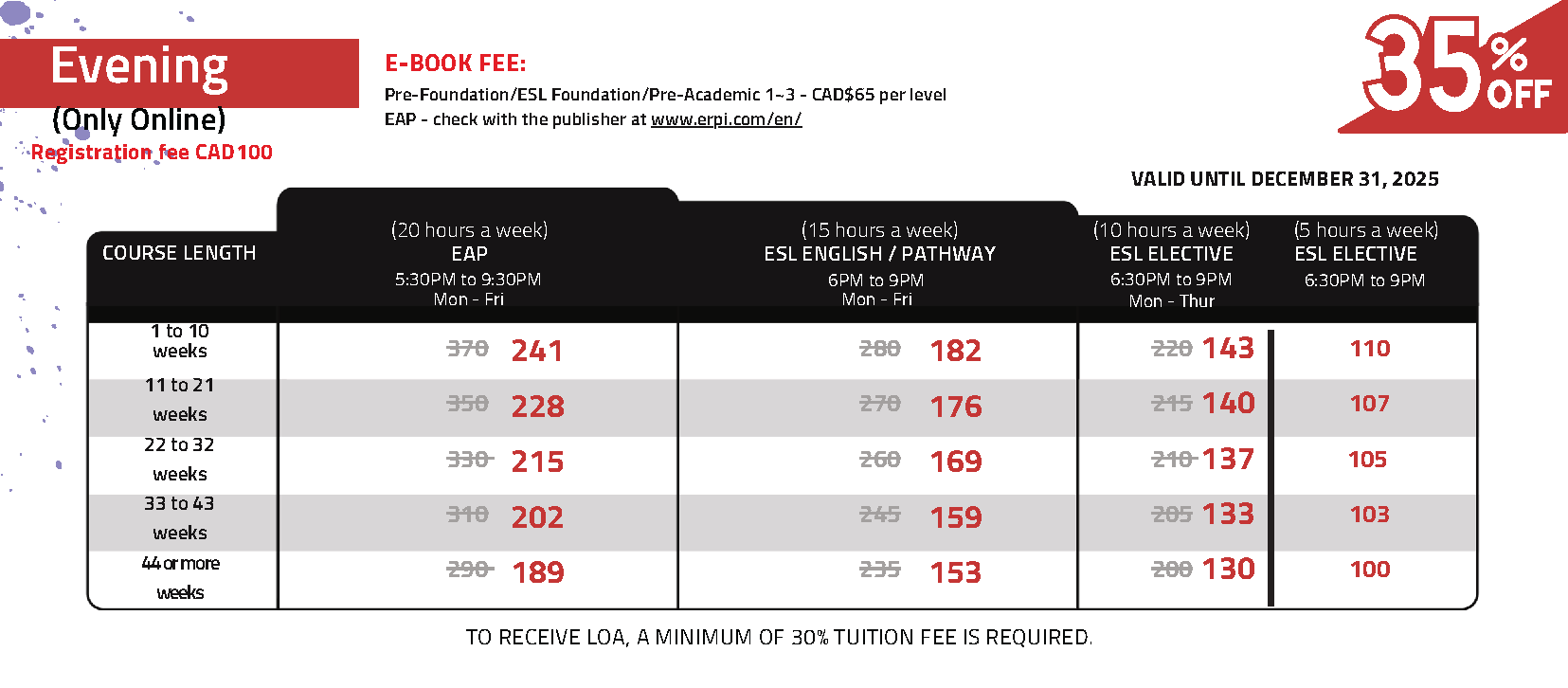 | 學費優惠 | ☑ 不限週數全面: 65折 |