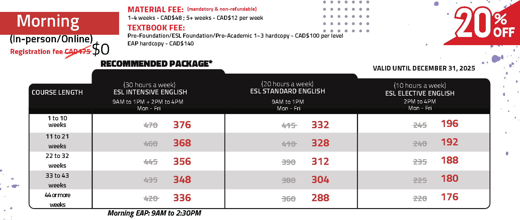 | 學費優惠 | ☑ 4週 - $1,300 ☑ 8週 - $2,600 ☑ 12週 - $3,800 ☑ 16週 - $5,000 |
