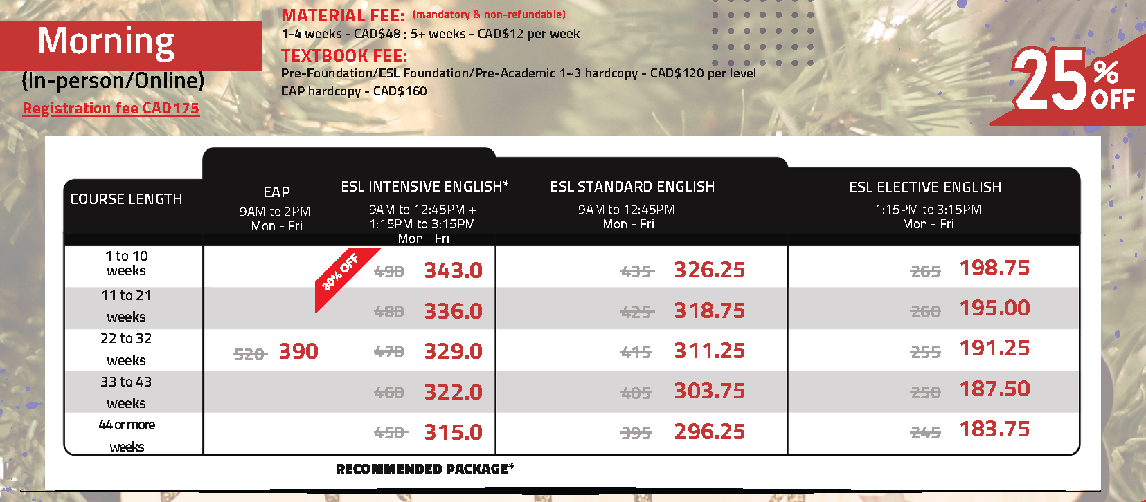 | 以上費用,未含教材費一週(CAD12)及註冊費(CAD175) | ||||