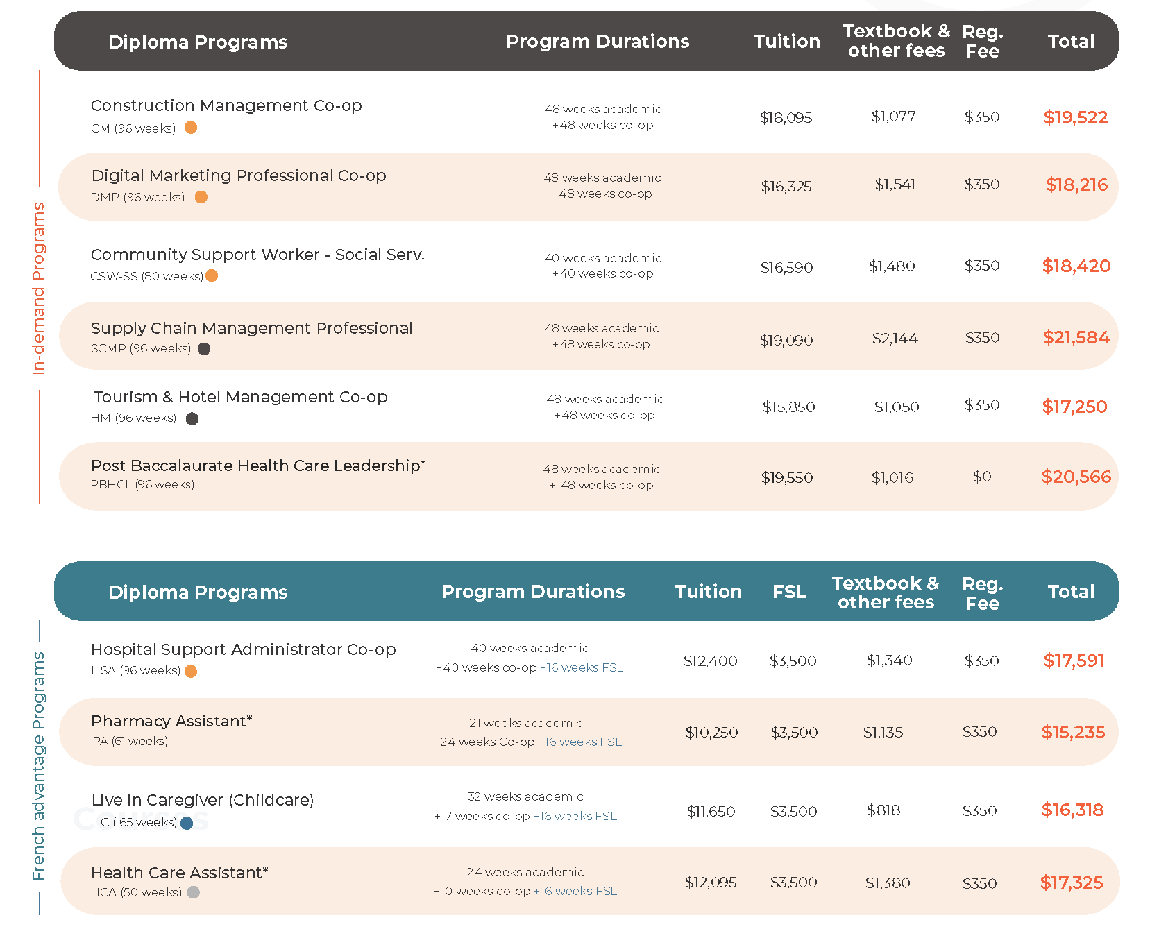 | 健康護理助理 | 24週半工半讀 + 10週工作實習 + 16週法語進修 | $17,325 |