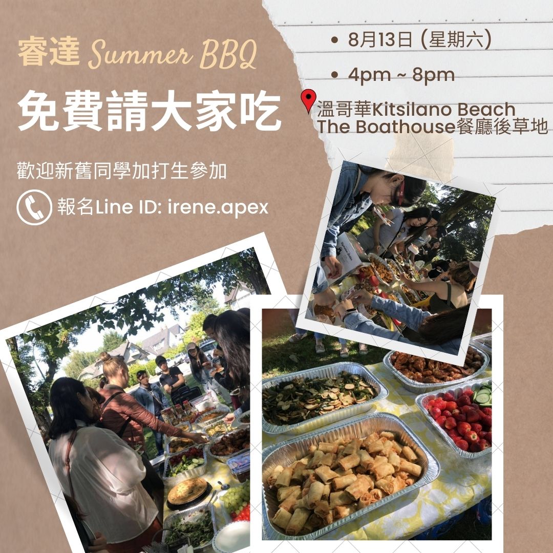 睿達年度夏日免費吃喝玩樂燒烤BBQ來了!透過這項活動,我們更希望帶出正能量,讓學員們分享當地學習、工作、生活與旅遊交流,讓我們台灣同學在加拿大更棒更優秀!