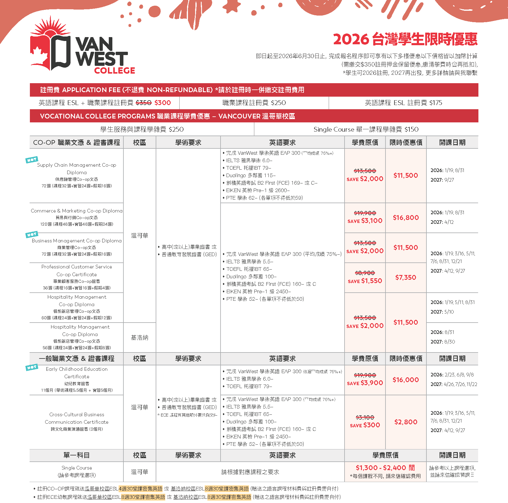 - 與ESL一起報名可享註冊費優惠 (省$50加幣)