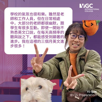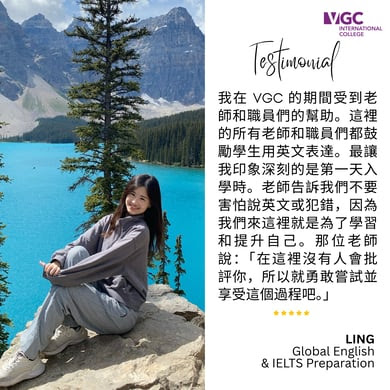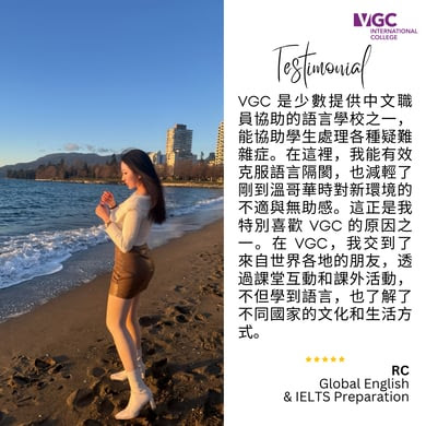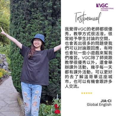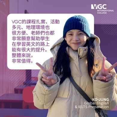 來自全球超過 85 個國家的學生選擇 VGC 是因為其高學術標準、教師素質、舒適的校園環境以及個別化的學生服務。選擇 VGC 獲得獨特的生活體驗,幫助學生實現英語語言和職業目標。如果您想在加拿大學習英語,VGC 國際學院是最佳選擇。此外,VGC 的國際商學院課程專為尋求商業基礎知識的加拿大和國際學生而設計,遊學打工 (Co-op) 學生可以獲得在加拿大公司行號的工作實習經驗,能夠將自己的技能應用到現實生活中。