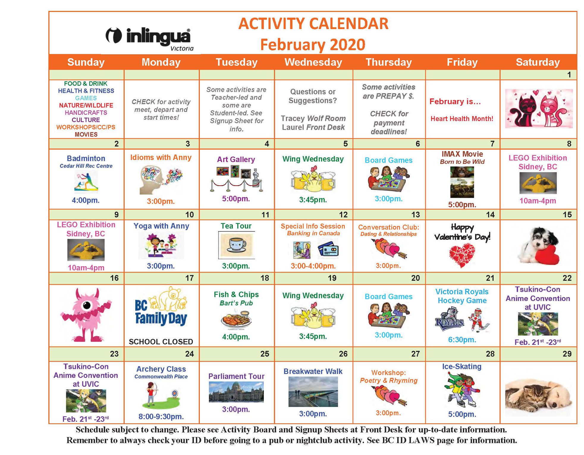我們為課堂外的學生提供有趣的活動,從體育到文化活動,再到觀光和遊覽城市景點,主要目的讓學生學習、了解加拿大文化和結交新朋友。這些活動包括: 攀岩,燒烤,皮划艇,游泳 ,保齡球 ,曲棍球,電影之夜,足球,溫哥華一日遊,滑雪之旅(惠斯勒或華盛頓山),賞鯨 ,排球等。