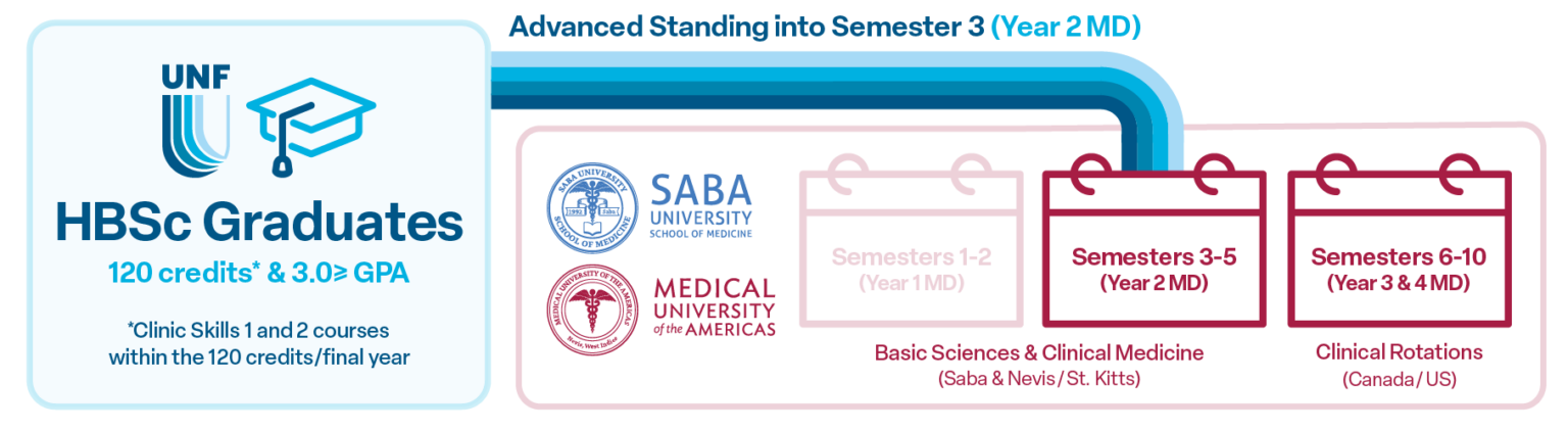 透過與薩巴大學醫學院和美洲醫科大學的合作,UNF 很自豪能夠為學習生物醫學科學理學士學位的學生,提供選擇醫學預科課程的選擇。該途徑是與合作夥伴醫學院的學術團隊充分合作開發的,成功完成生物醫學科學學士學位且 GPA 為 3.0 或更高的畢業生,將允許畢業生直接進入醫學博士課程的第二年兩所合作醫學院。
