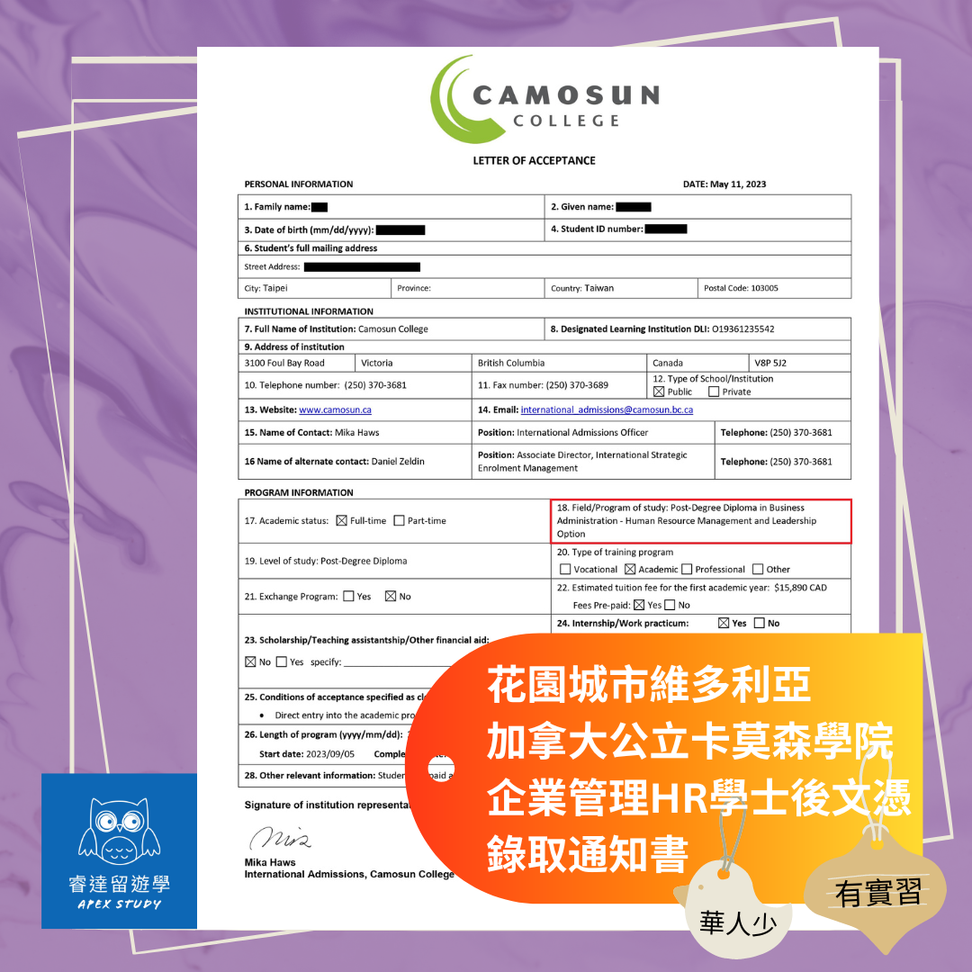 越來越多學員選擇非多倫多和溫哥華的大城市,今年九月,我們睿達又有一位新學員,將踏上加拿大溫哥華島 – 最美麗的花園城市維多利亞,公立學院卡莫森學院(Camosun College)就讀企業管理 - 人力資源管理和領導力主修,學士後文憑,可在2年內完成。就學期間可半工半讀,畢業後可申請工作簽證,不需雇主擔保,最長可獲得3年。學費只要加幣$25,470,相較於其他公立學院便宜很多。