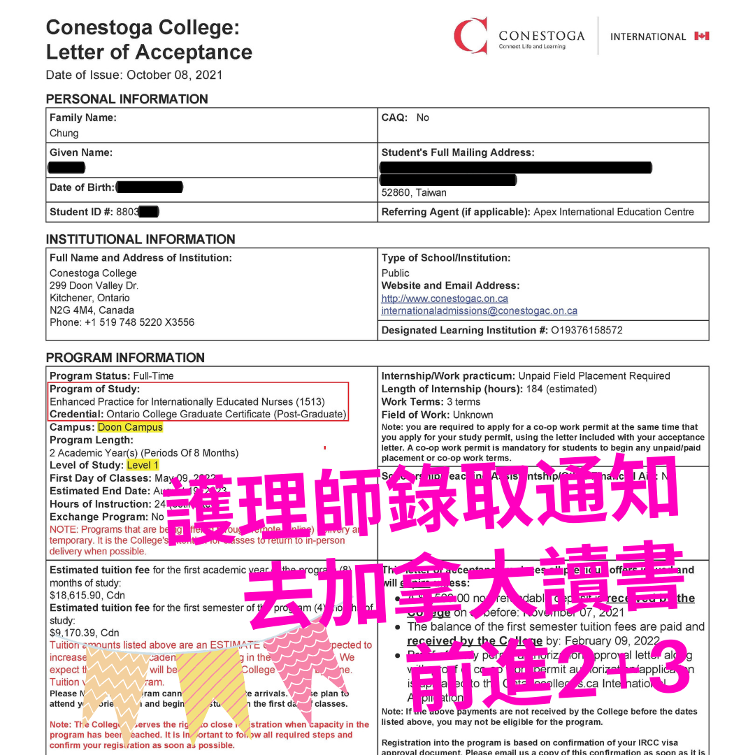 在台完成線上英語銜接課程,免雅思考試,成功獲得2022年5月公立學校錄取通知,加拿大安大略省Conestoga College歡迎我們鐘同學台灣護理師,明年春天出發,踏上加拿大RN註冊護理師資格學習與考試。