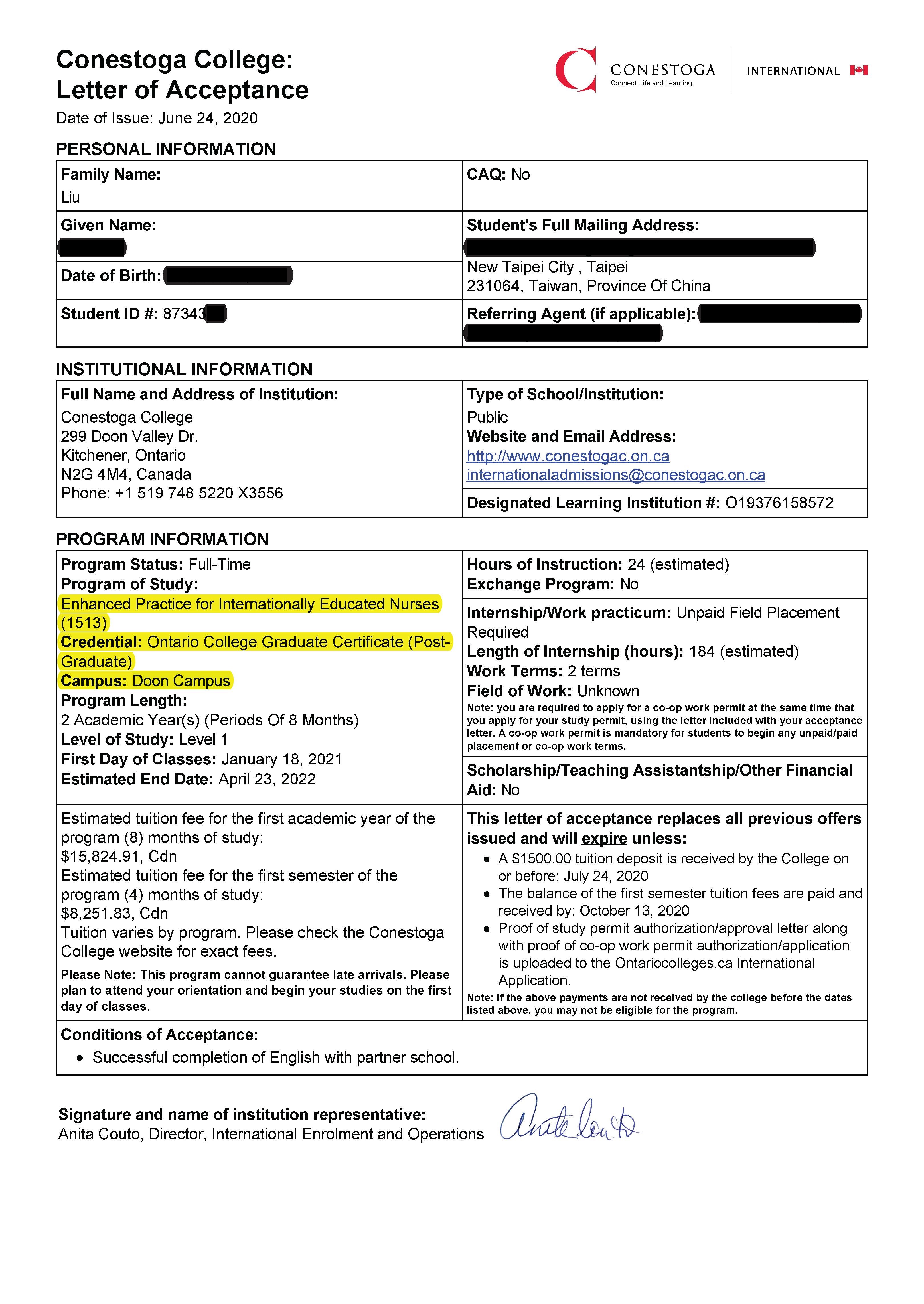 不能再多說甚麼了,端午節後我們幫一位台灣護理師,拿到了加拿大公立學院Conestoga College研究生證書錄取通知,即將邁上加拿大RN註冊護理師資格考試。