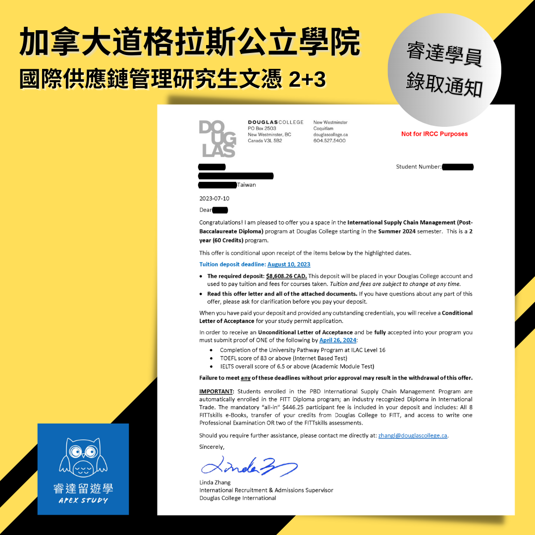 2年加拿大公立學院研究生(學士後),就業導向文憑課程入學信到手,恭喜睿達新學員,收到2024年5月入學,Douglas College國際供應鏈管理錄取通知書,實現2+3進入加拿大職場夢想。
