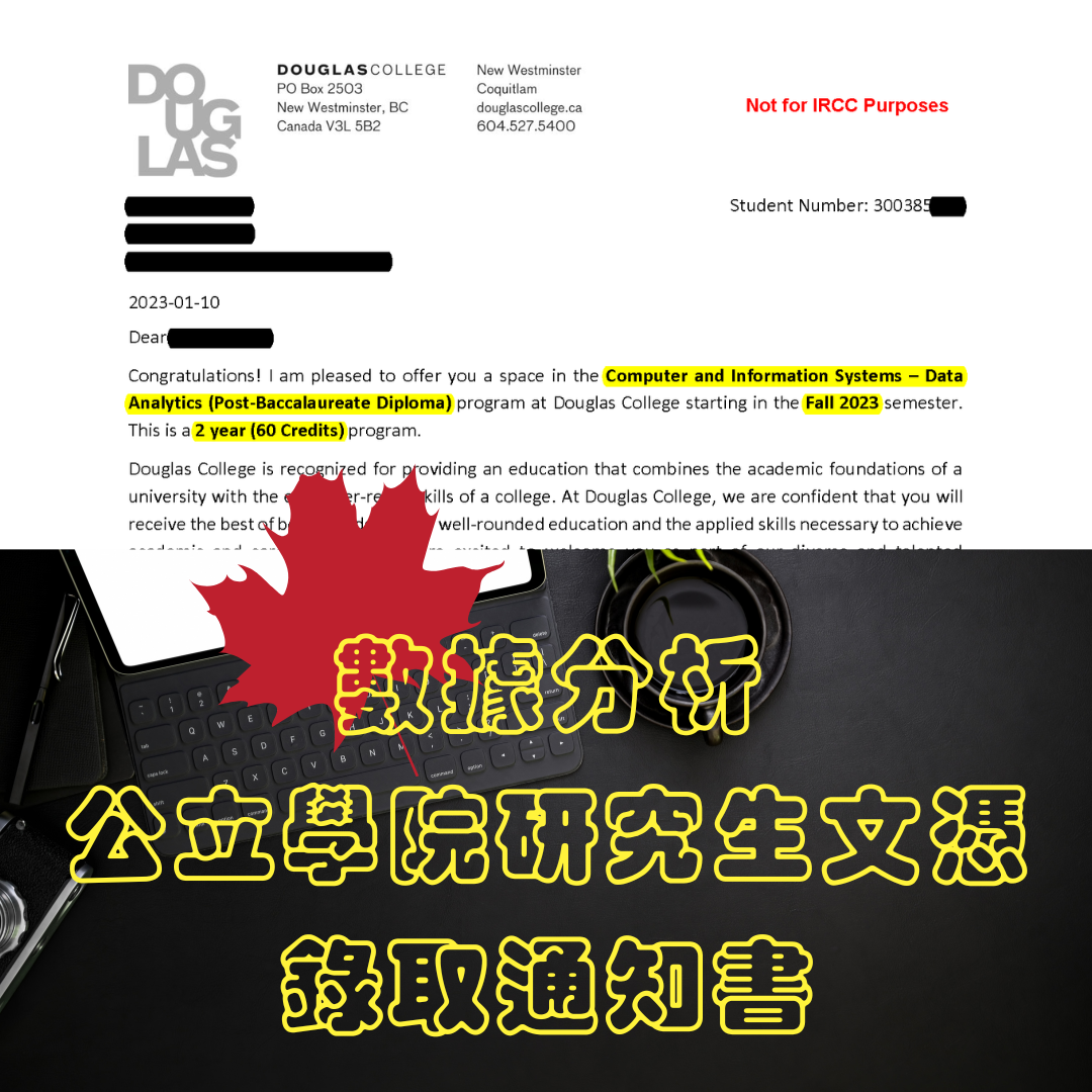 這是加拿大西岸BC省公立學院Douglas College,最夯的專業課程之一了。恭喜睿達新學員,成功拿到錄取通知書,今年9月即將開課就讀含金量超高的電腦和資訊系統 - 數據分析研究生文憑,符合加拿大簽證處規定,2年就學期間半工半讀,畢業後提出申請3年工作簽證。