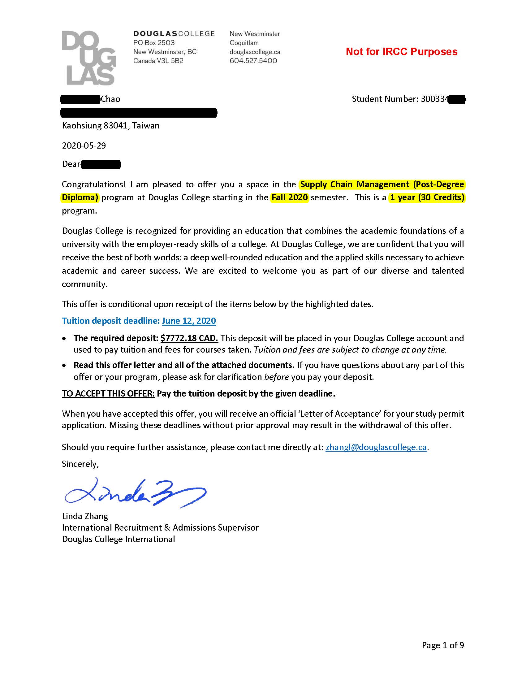 又來了,入學信又來了!恭喜我們趙同學,獲得加拿大西岸公立學院Douglas College一年供應鏈管理錄取通知。