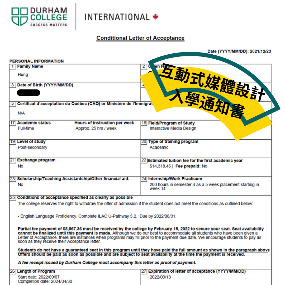 新春來放第一串鞭炮,洪家姊妹要出國,恭喜妹妹拿到加拿大安大略省公立學院 - Durham College錄取通知,今年九月要進入互動式媒體設計課程就讀啦!