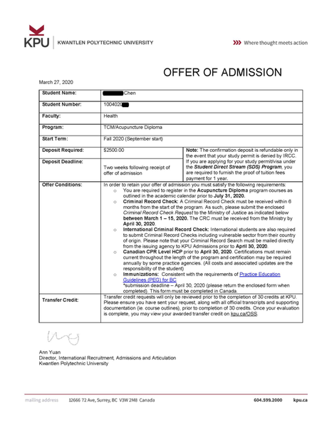 又是興奮的時刻到來,恭喜我們陳同學,成功獲得加拿大西岸公立Kwantlen Polytechnic University(KPU)昆特蘭理工大學錄取通知,今年九月將就讀傳統中醫 - 針灸文憑課程(Traditional Chinese Medicine - Acupuncture Diploma)。
