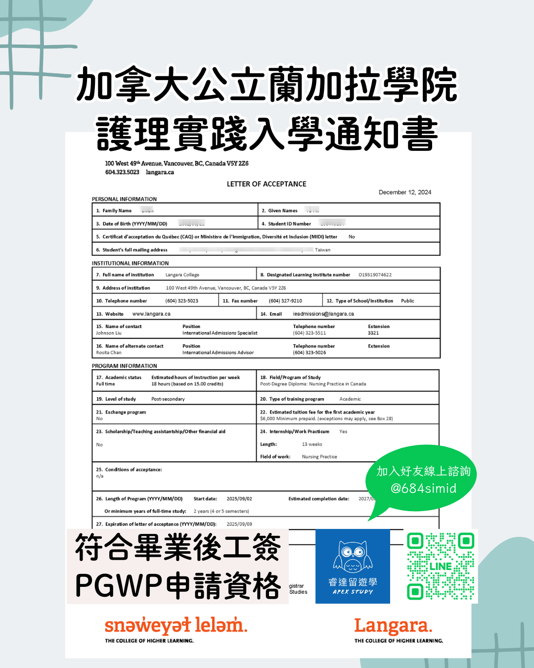睿達新學員錄取通知書,恭喜台灣護理師同學,將於2025年9月正式入學開課,選擇加拿大西岸BC省公立學院 – Langara College(蘭加拉學院)。