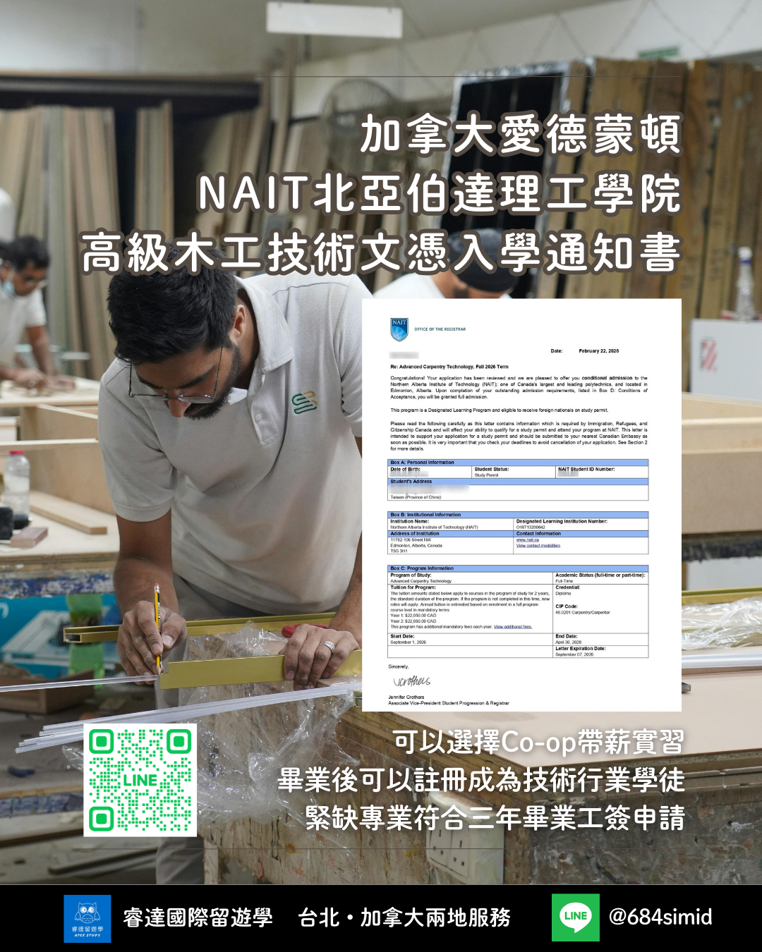 完成高級木工技術文憑工作實習計畫的學生,如果畢業後攻讀木工技師證書,可以將工作經驗時長計入學徒期。完成文憑工作實習計畫的國際學生,需要獲得畢業後工作許可,可以自行申請學徒,也可以由北亞伯達理工學院 (NAIT) 幫助,以攻讀木工技師證書。