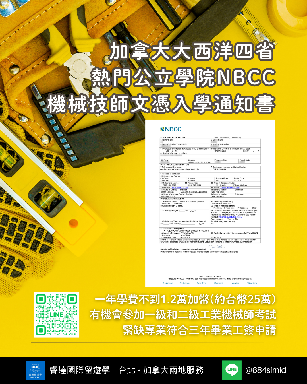 完成NBCC的專業緊缺類別,兩年以上課程,可以申請政府三年畢業後工作簽證。