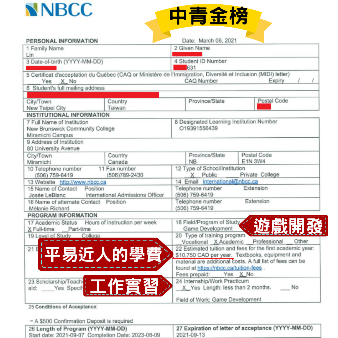 林同學選擇了位於加拿大東岸新布倫瑞克省的NBCC,因為他覺得該省分離法語區的魁北克很近,由於他本人對於語言的學習情有獨鍾,覺得就是要到新布倫瑞克省來發展! 再來就是他覺得說出國就是想要學習第二專長,遊戲開發一直是學生很有興趣的一項專業! 今年1月15號透過中青送出申請,三月初就拿到了NBCC的OFFER, 在這等待的日子裡,時間並不那麼漫長啦🤣🤣🤣