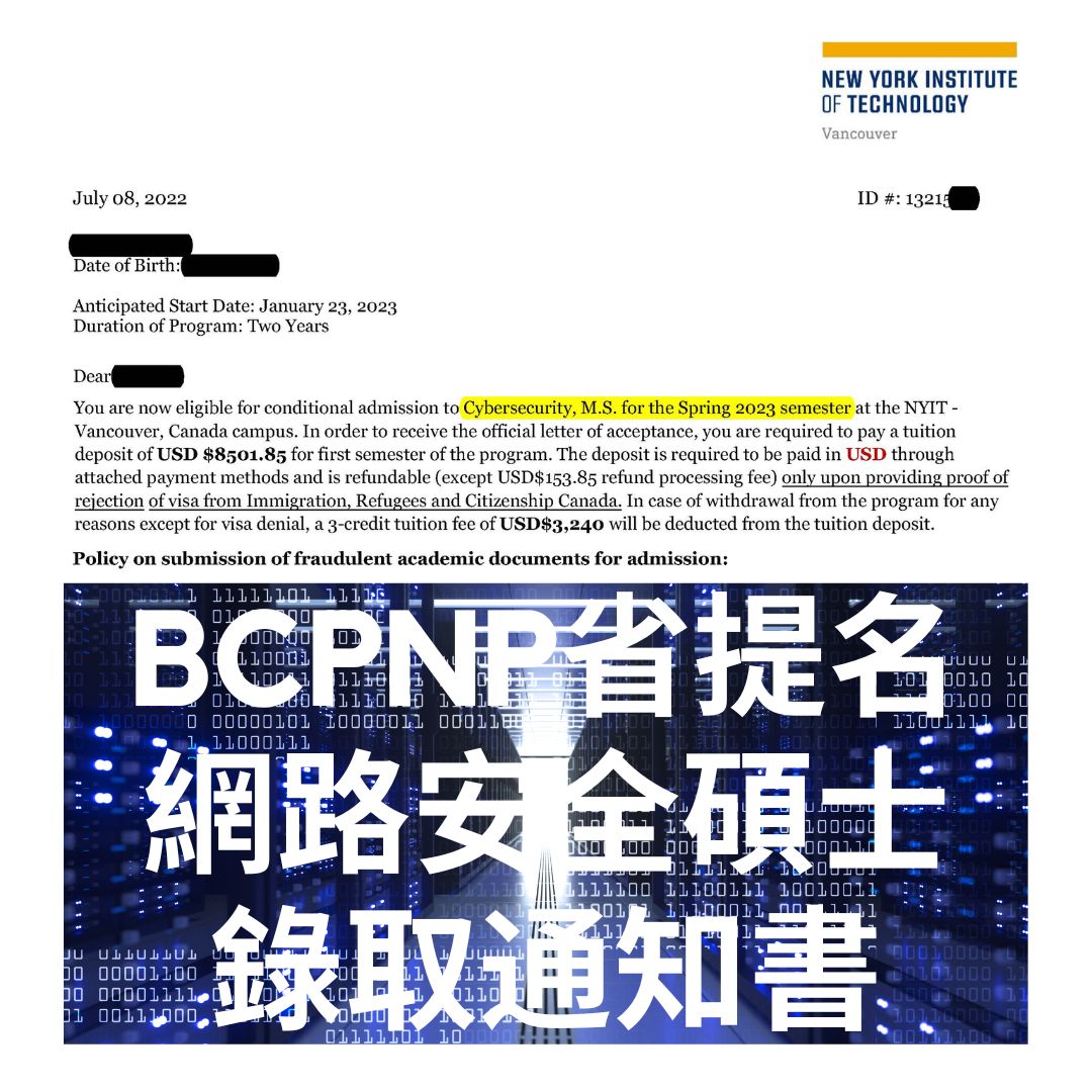 加拿大碩士入學信開獎!恭喜我們學員,獲得NYIT紐約理工大學溫哥華校區,網路安全碩士錄取通知,2023年1月即將入學就讀,該課程符合BC省提名計畫資格。