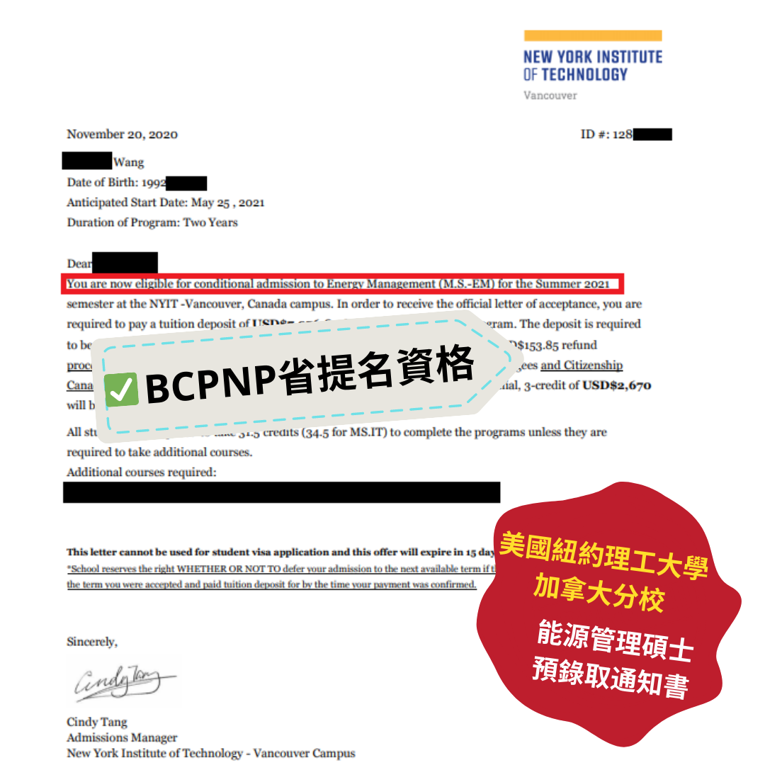 王同學碩士入學通知終於到手💪💪💪 NYIT紐約理工學院加拿大溫哥哥華校區,能源管理碩士(Master of Energy Management),符合加拿大BCPNP省提名資格!