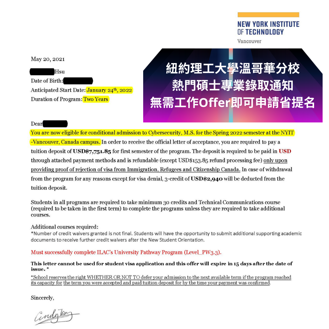 疫情期間,要來一些正能量的消息,恭喜我們許同學,拿到NYIT紐約理工大學溫哥華校區,電腦網路安全碩士錄取通知,2022年1月將入學。