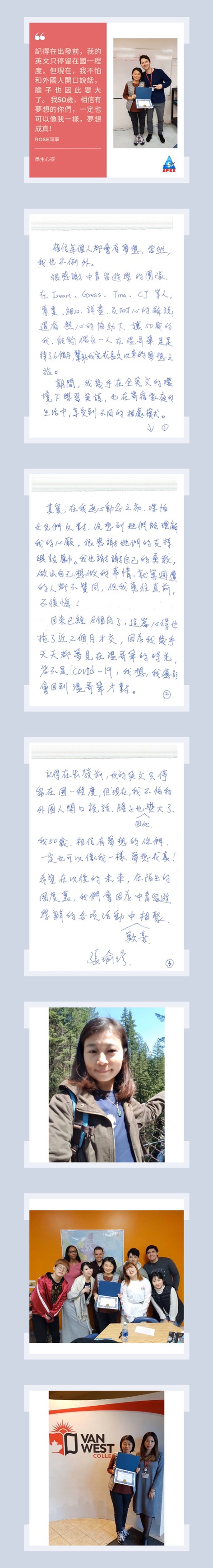 小編我CJ,是在溫哥華認識Rose姐的,Rose姐一直是很熱心,很為其他在學校認識的台灣學生著想的人。也常常介紹其他台灣學生來認識我們睿達留遊學(Apex International Education Centre)。在這裡要好好的先跟我們的Rose姊說聲感謝~~