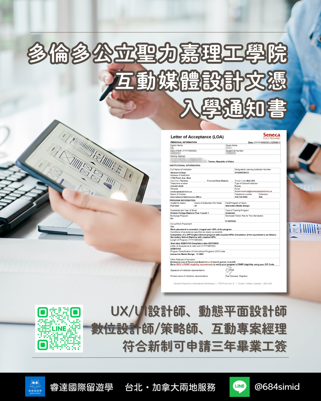 互動媒體設計 (Interactive Media Design),是一個兩年制,共計四學期的文憑課程。在加拿大多倫多聖力嘉理工學院 (Seneca Polytechnic) 約克校區進行學習,每年1月、5月、9月開課。