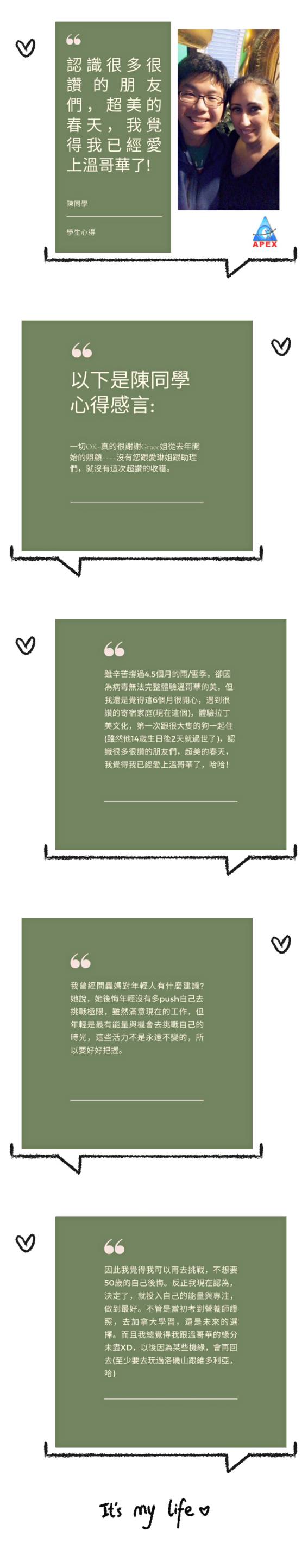 去年11月去加拿大英語遊學的陳同學,經歷疫情,最後幾週在當地完成線上課程,並以優異成績第16級畢業(滿級17級),等同雅思6.5以上實力。