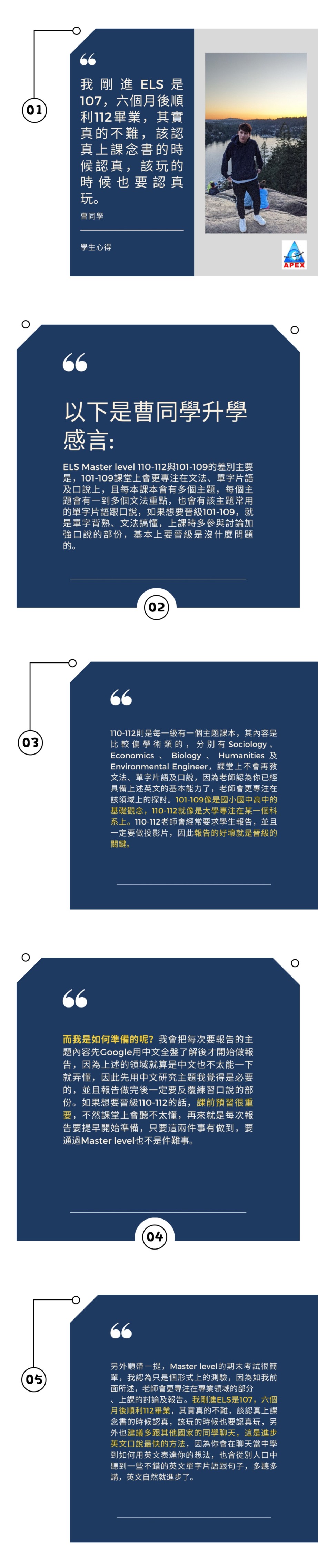 “ ELS Master level 110-112與101-109的差別主要是,101-109課堂上會更專注在文法、單字片語及口說上,且每本課本會有多個主題,每個主題會有一到多個文法重點,也會有該主題常用的單字片語跟口說,如果想要晉級101-109,就是單字背熟、文法搞懂,上課時多參與討論加強口說的部份,基本上要晉級是沒什麼問題的。而110-112則是每一級有一個主題課本,其內容是比較偏學術類的,分別有Sociology、 Economics 、Biology、Humanities及Environmental Engineer,課堂上不會再教文法、單字片語及口說,因為老師認為你已經具備上述英文的基本能力了,老師會更專注在該領域上的探討。101-109像是國小國中高中的基礎觀念,110-112就像是大學專注在某一個科系上。110-112老師會經常要求學生報告,並且一定要做投影片,因此報告的好壞就是晉級的關鍵,而我是如何準備的呢?我會把每次要報告的主題內容先Google用中文全盤了解後才開始做報告,因為上述的領域就算是中文也不太能一下就弄懂,因此先用中文研究主題我覺得是必要的,並且報告做完後一定要反覆練習口說的部份。如果想要晉級110-112的話,課前預習很重要,不然課堂上會聽不太懂,再來就是每次報告要提早開始準備,只要這兩件事有做到,要通過Master level也不是件難事。另外順帶一提,Master level的期末考試很簡單,我認為只是個形式上的測驗,因為如我前面所述,老師會更專注在專業領域的部分、上課的討論及報告。我剛進ELS是107,六個月後順利112畢業,其實真的不難,該認真上課念書的時候認真,該玩的時候也要認真玩,另外也建議多跟其他國家的同學聊天,這是進步英文口說最快的方法,因為你會在聊天當中學到如何用英文表達你的想法,也會從別人口中聽到一些不錯的英文單字片語跟句子,多聽多講,英文自然就進步了。”