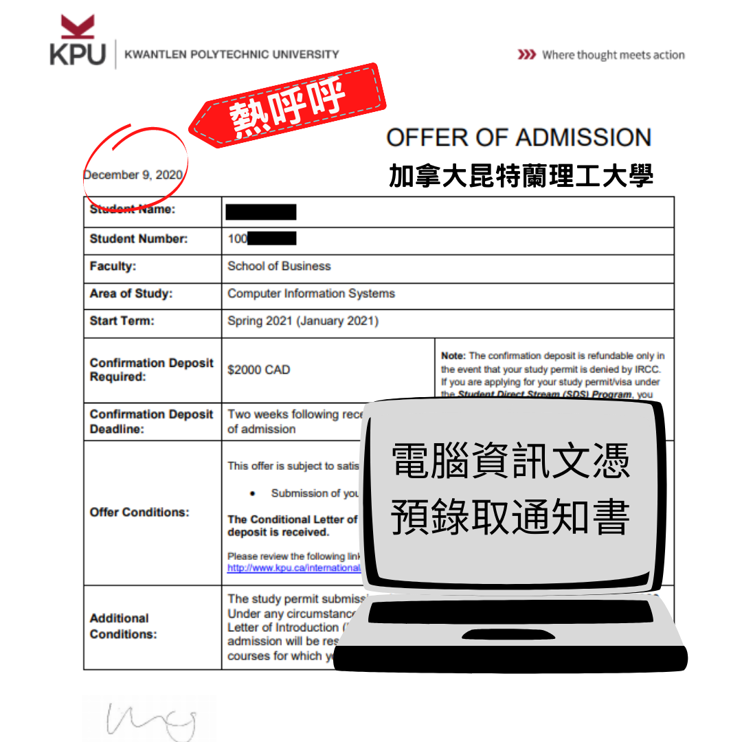前幾天才剛結束我們與加拿大昆特蘭理工大學的線上座談會, 馬上我們田同學就拿到了一張他們學校的預錄取通知書! 這個電腦資訊文憑是兩年的文憑課程, 就學期間不但可以半工半讀之外, 學校還提供學生建教合作的選項, 學生有機會在有薪的實際工作經驗學期中應用在學術學習中獲得的技能。學生可以在完成文憑的同時完成兩個工作學期。工作期限通常是四個月工作學期中全日制進行。工作學期與學術學習交替進行。