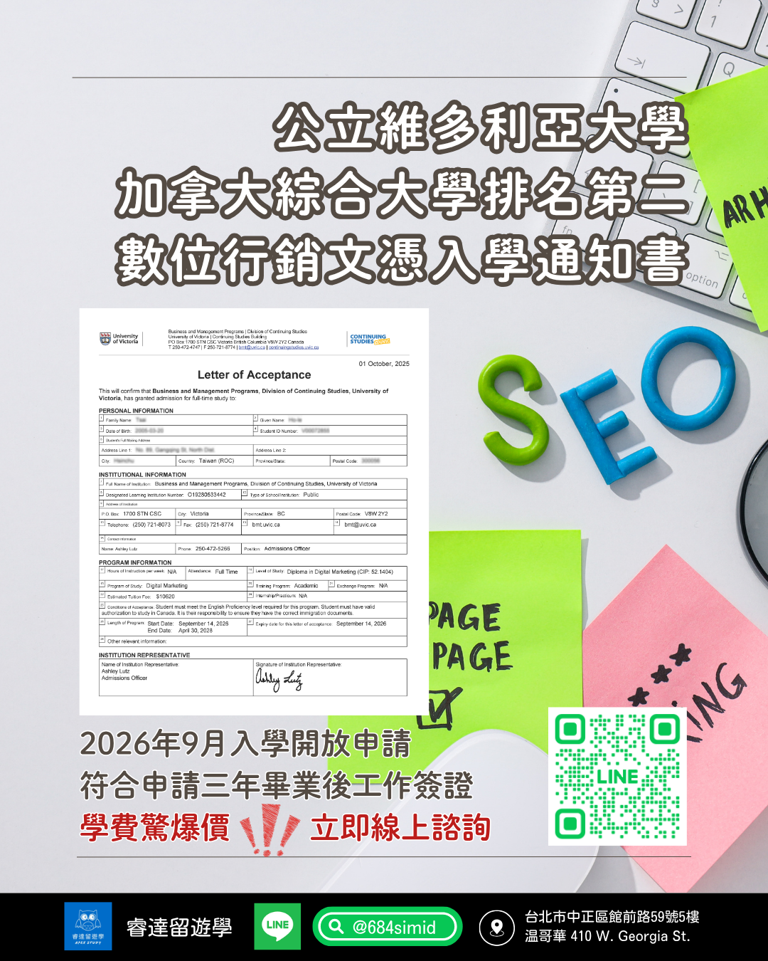 現在維多利亞大學,2026年9月與2027年1月入學,兩年專業文憑課程,申請已經開放,名額有限,立即與睿達顧問免費諮詢,加入Line: https://lin.ee/33LEJH9,本公司另有代辦該校大學與研究所申請。