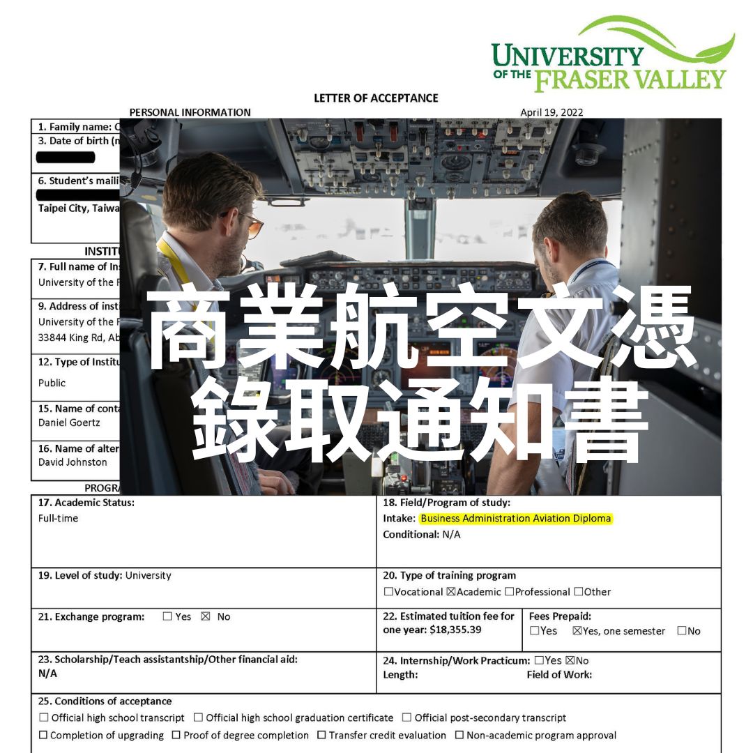 恭喜陳同學,成功獲得加拿大西岸University of the Fraser Valley (UFV.ca) 菲莎河谷大學錄取通知,今年九月即將進入兩年的企業管理 - 航空文憑就讀。完成第一年的學習後,Co-op工作實習學生,可在全日制學習學期和全日制帶薪工作學期之間交替進行。