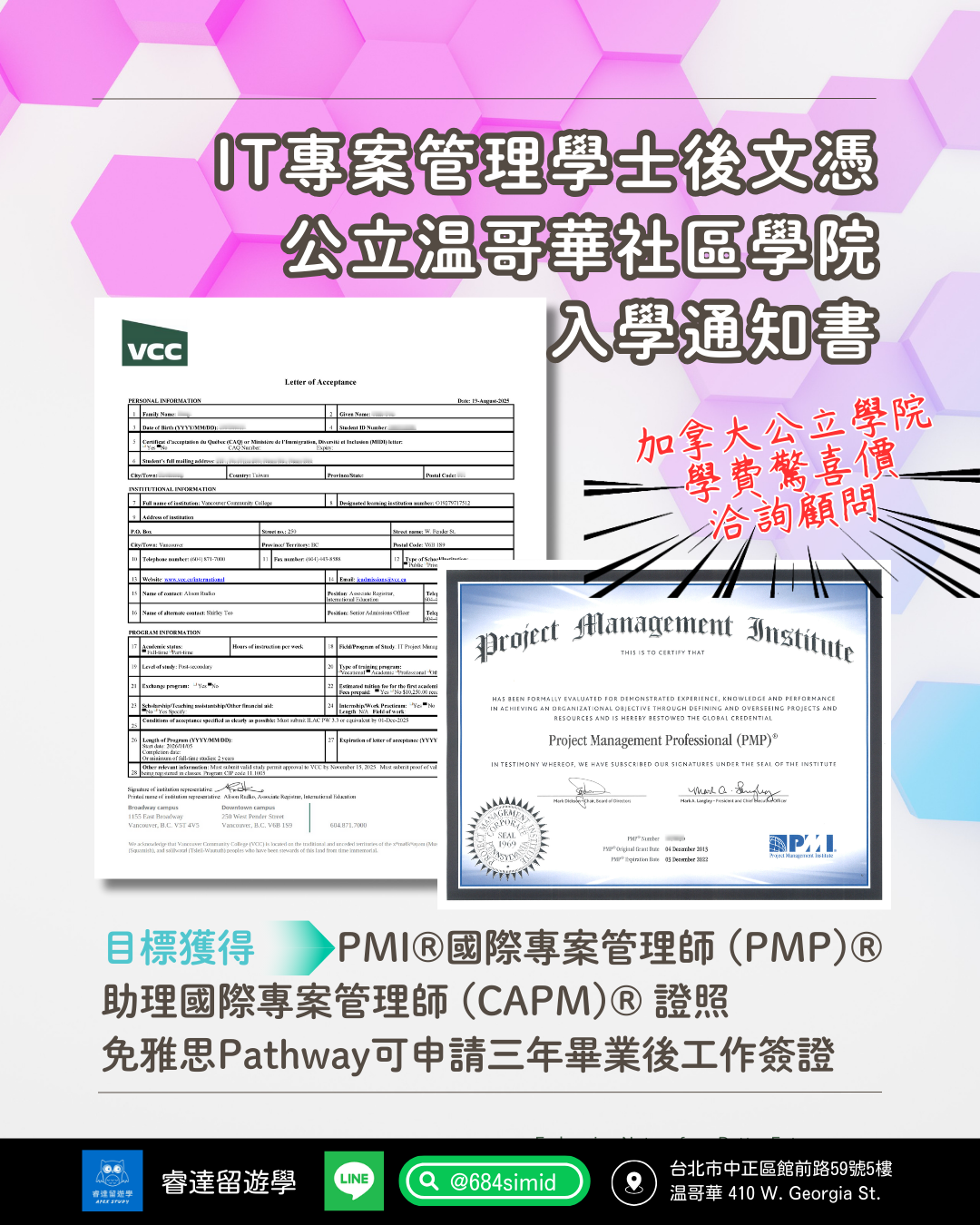 VCC的IT專案管理學士後文憑,為期兩年,就學期間可校外打工,課程內容以學習規劃、執行和監控 IT 專案的關鍵策略和流程為主。了解敏捷方法和瀑布方法之間的區別,並掌握獲得 PMI® 國際專案管理師 (PMP)®、助理國際專案管理師 (CAPM)® 等認證及其他專案管理資格所需的技能。