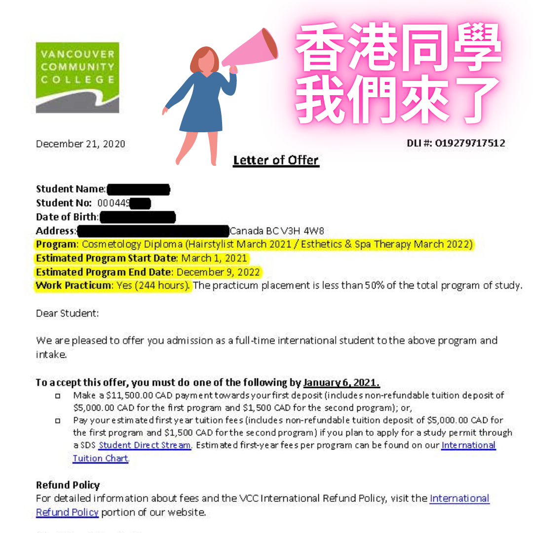 超人特工代辦團隊,今天成功幫助一位香港家庭,重回加拿大懷抱,拿到公立溫哥華社區學院VCC的入學信,明年3月開始進入髮型設計與SPA美學課程就讀。