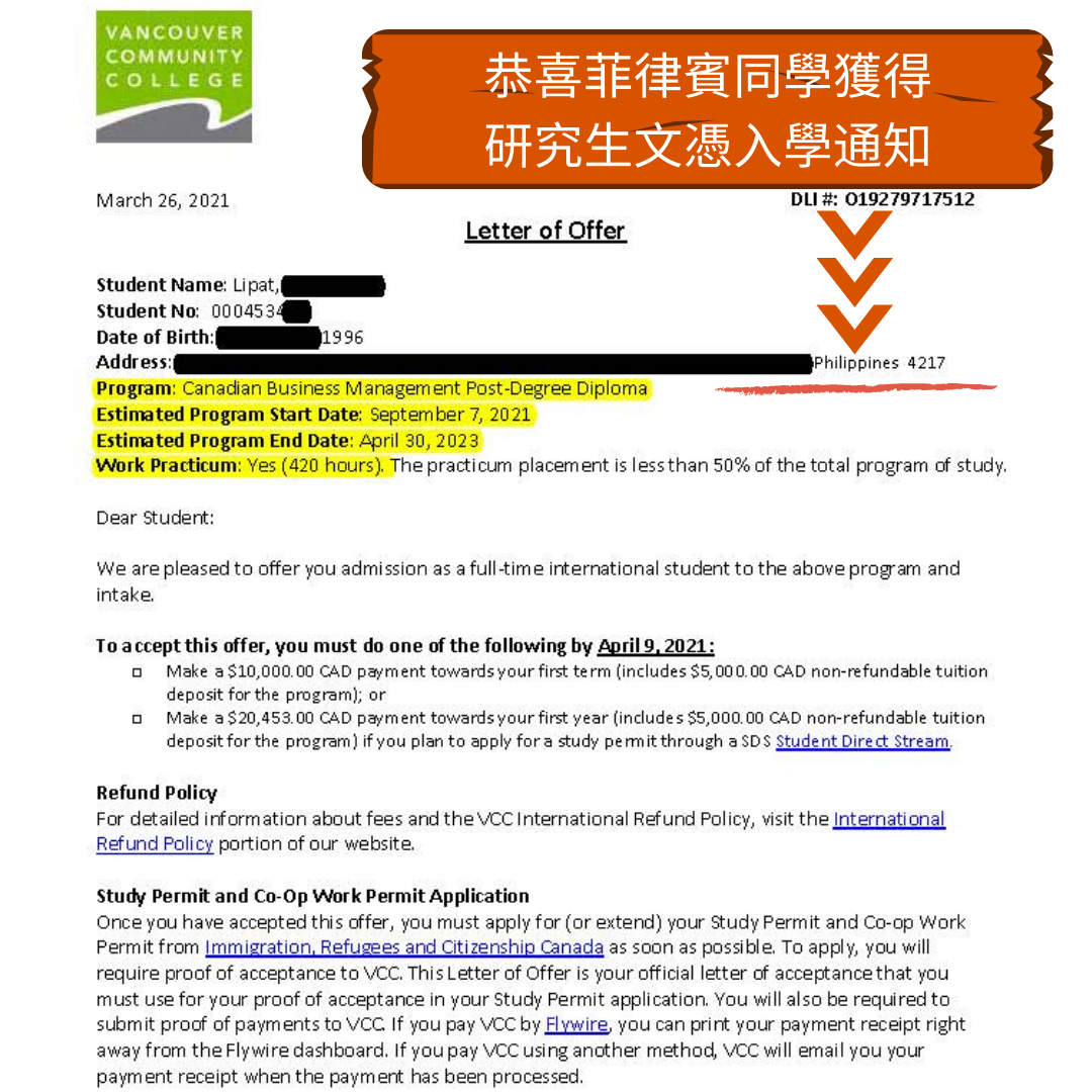 代辦團隊這次跨越呂宋海峽,將25歲的菲律賓同學,送去溫哥華社區學院(VCC)就讀加拿大研究生文憑課程啦,加拿大公立學校,完全符合畢業後可申請三年工作簽證資格。